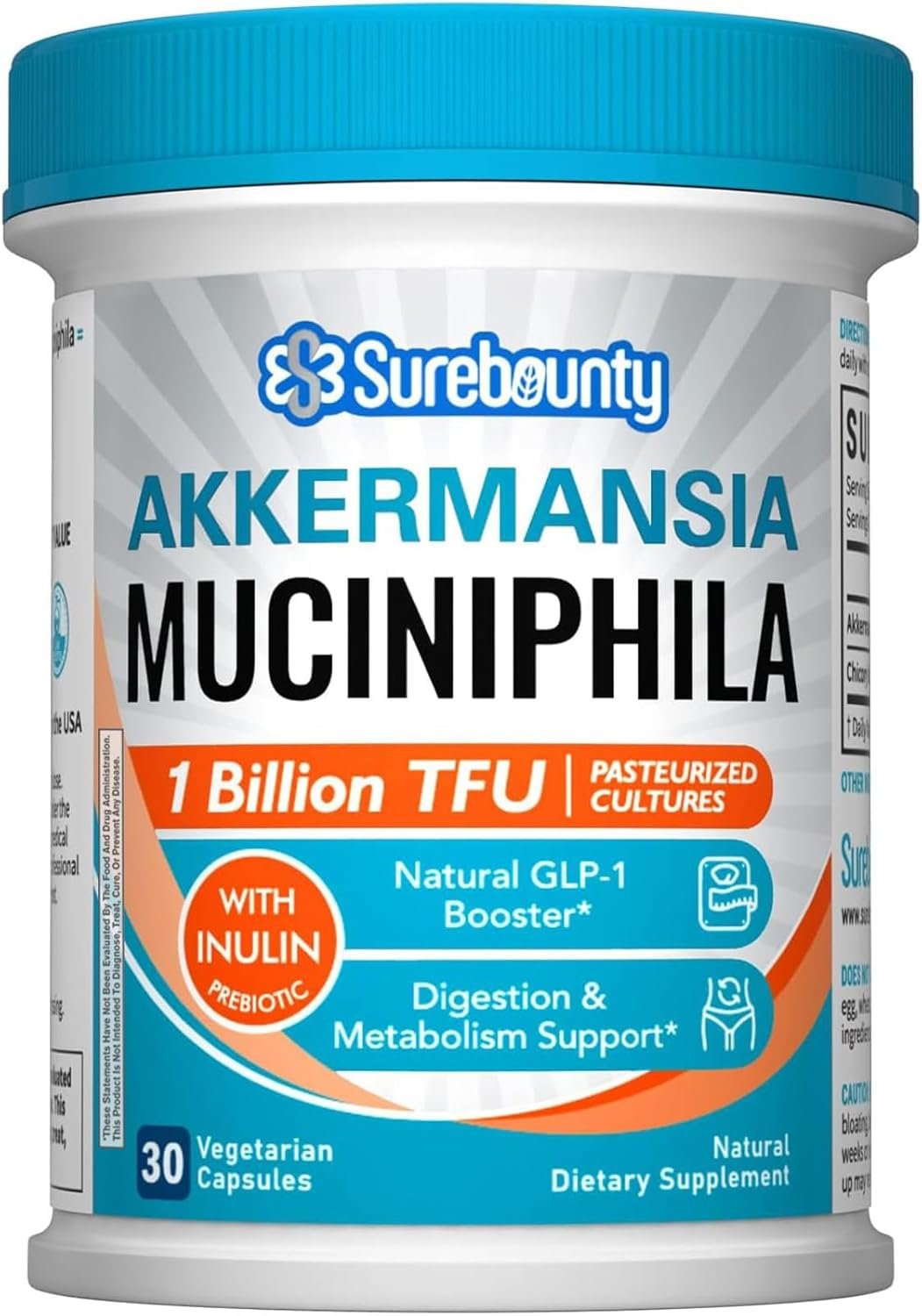 Natural GLP-1 Booster*: Surebounty’s 1 vegan capsule packs cutting-edge probiotic & prebiotic – 1 billion of pasteurized akkermansia muciniphila and 200 mg of chicory inulin – specially designed to support the body’s natural GLP-1, metabolism, and digestion.* Take One vegan capsule daily, Feel Light, Eased & Energetic with Surebounty Akkermansia Muciniphila!*