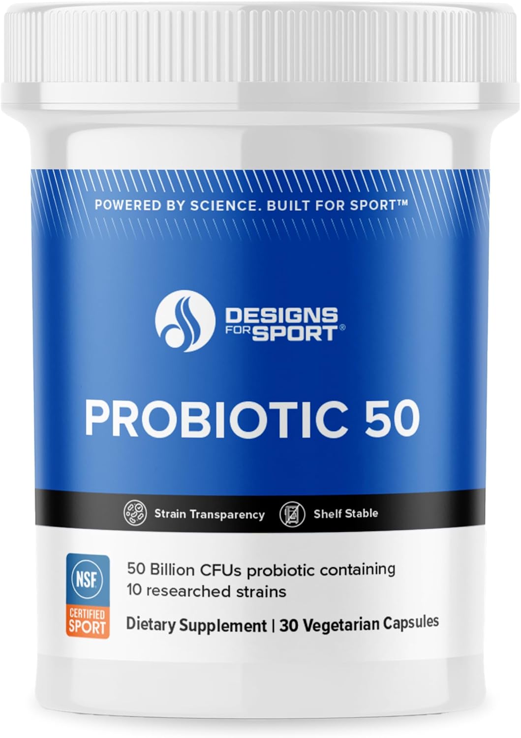 High-Performance Formula: Designs for Sport Probiotic 50 delivers 50 billion CFUs from 10 clinically researched strains to help maintain gut health, digestive health, and immune function*