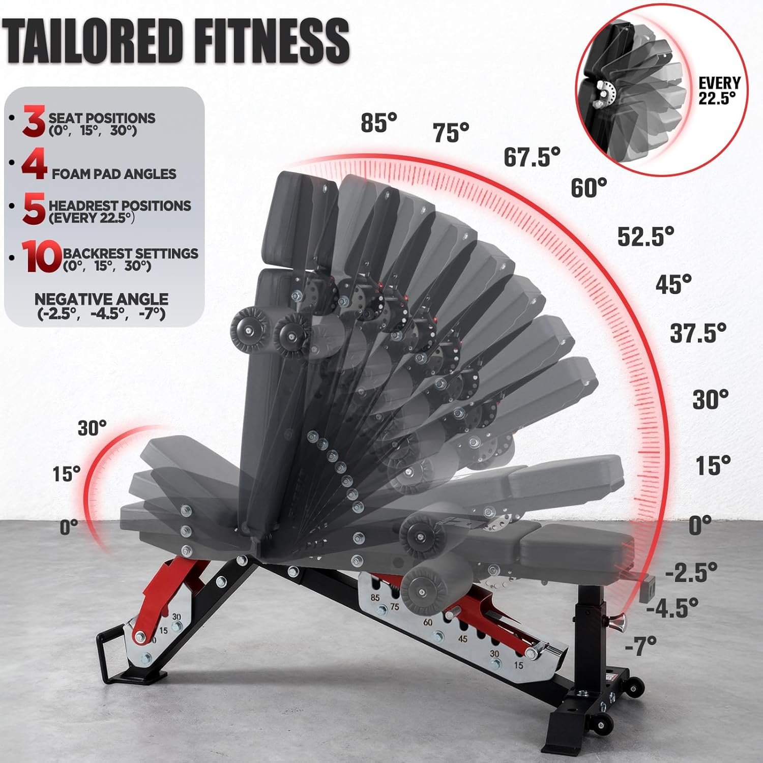 【21-Level Full Adjustment for Total Body Training】Customize your workout with 21 adjustable positions — 10 backrest angles (0°–85°), 5 headrest angles (each 22.5°), 3 seat angles (0°, 15°, 30°), and 3 negative decline settings (-2.5°, -4.5°, -7°). With 4 foam pad installation options, this weight bench allows users to quickly switch between incline, flat, and decline positions, supporting a wide range of exercises like bench presses, dumbbell flyes, or sit-ups. Whether you’re training chest, abs, or legs, it provides more efficient transitions, optimized muscle targeting, and a smoother workout experience for every fitness level.