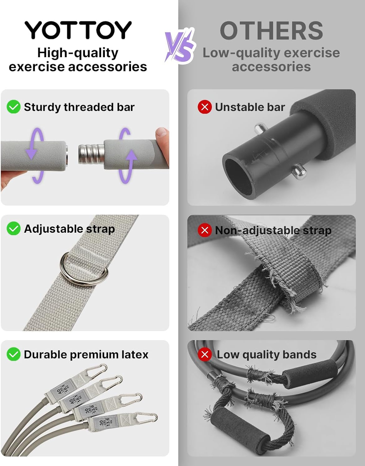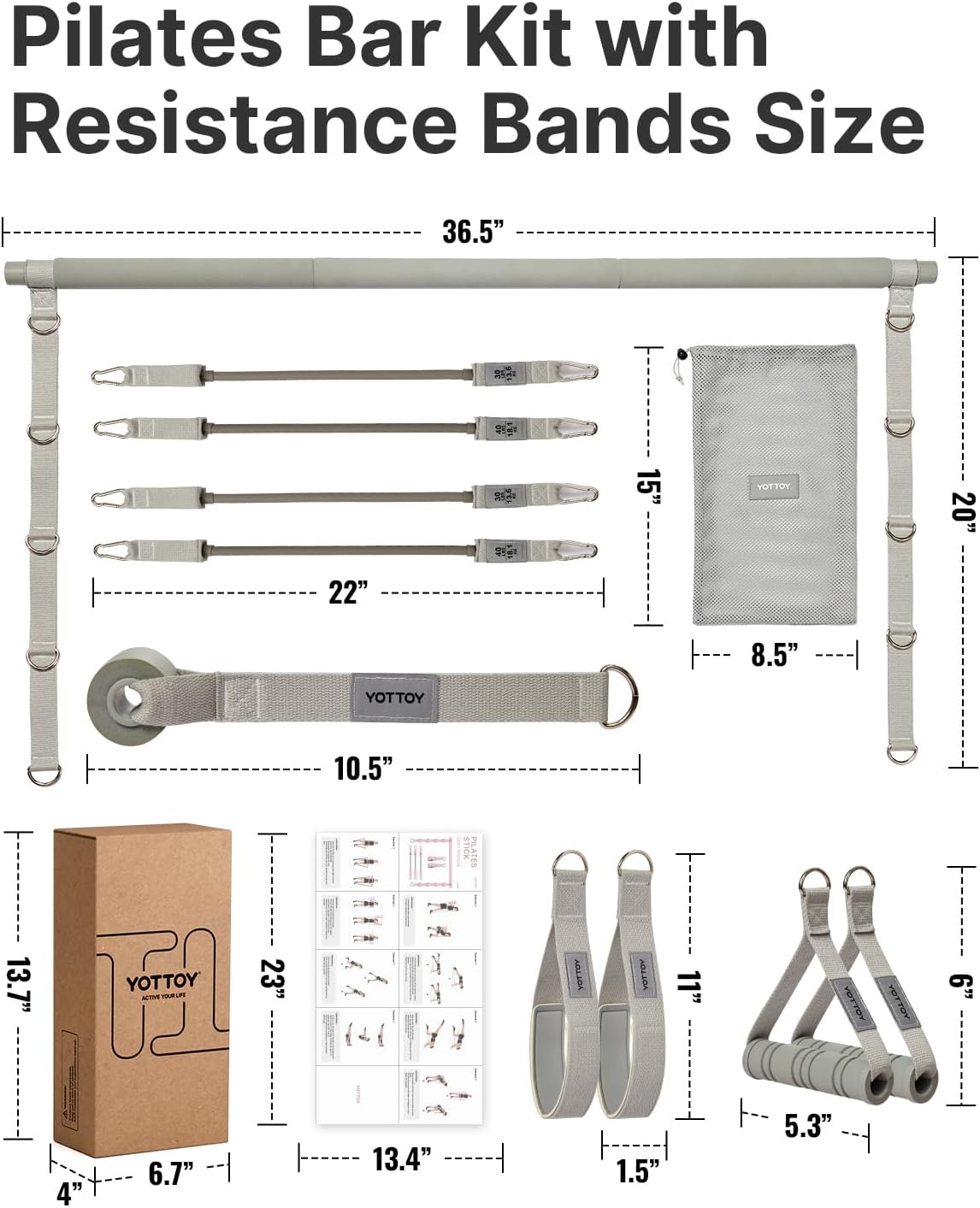 1.YOTTOY Pilates Bar Kit — Durable Resistance Bands Set: Nylon-reinforced carabiner connection ensures stronger wear resistance than direct band-to-carabiner designs. Ideal for Pilates, resistance training and home workouts